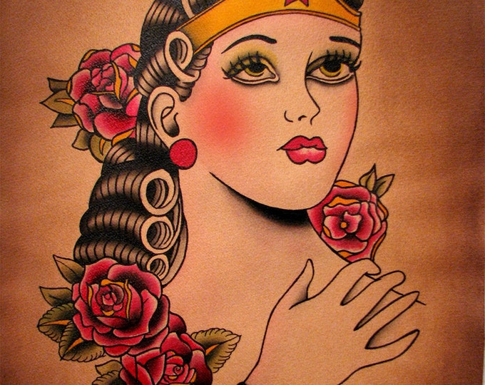 Vintage Style Traditional American Wonder Woman Tattoo Flash Painting Print Poster 18x24