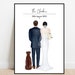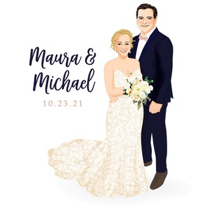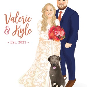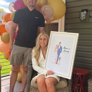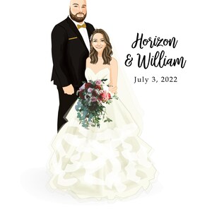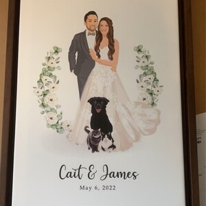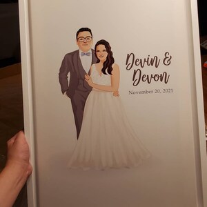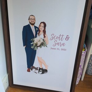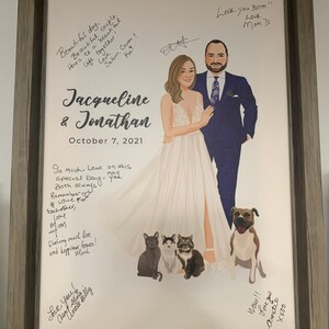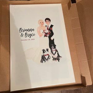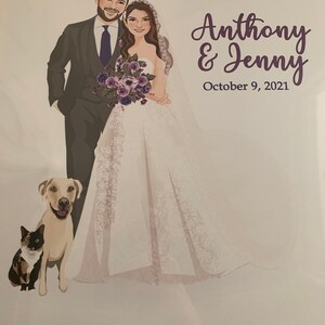 This CUSTOM illustrated guest book is an awesome alternative to the traditional wedding guest book. This stunning artwork doubles as seriously fun wedding decor, and your guests will actually want to sign it at your wedding reception! It features a cartoon illustration of the happy couple, created from the photos and descriptions you provide. The artwork will be completely customized to look just like the two of you, including hairstyles, clothing, accessories – you can even include your children or pets!