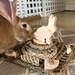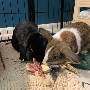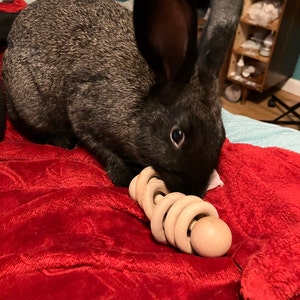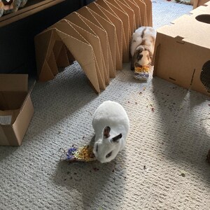 Cute. Bunny ran off to hide with one end of the string . Left a trail. I’ve cut pieces off and he chews on it every now and then. Just trying to find stuff he likes.