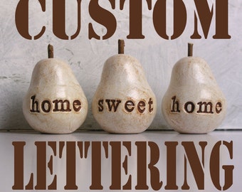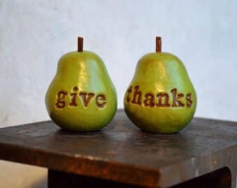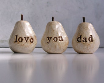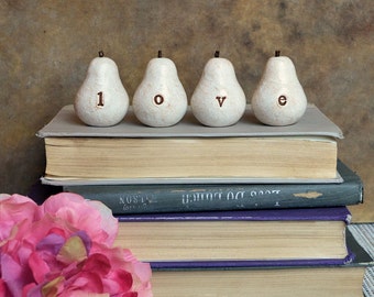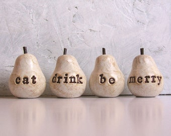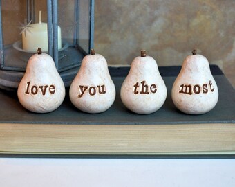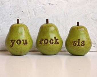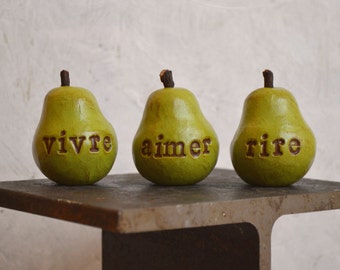 Three of the most darling little pears you will ever lay eyes on. Handmade by moi, and then stamped with words. I don't ever use molds or templates to make my sculptures, they are totally handmade from start to finish by me. Made of polymer clay and painted, and finished with a coat of high quality clear varnish.