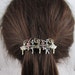 Angelina is about 3.5 inches tall. She can come attached to a partially lined single prong alligator clip, a double prong alligator clip, or a pin. A no slip grip can be added to the alligator clips. The clip/pin runs up her back to add stability and so she can be worn on either side of the head.