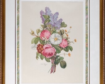 Vintage French Flower Print - Jean Louis Prevost Bouquets - Peony Rose Tulip Morning Glory - 1945 Etching Tone