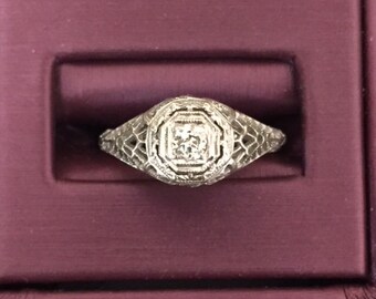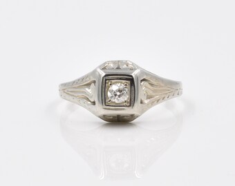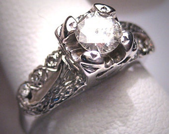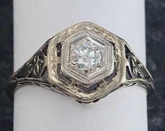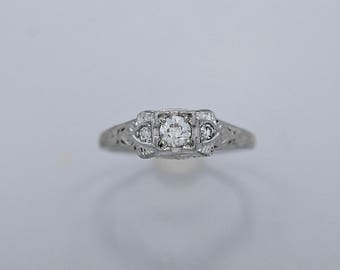 Antique 20s Diamond Solitaire - Vintage Engagement Wedding Ring with Filigree Detail