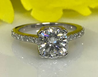 Certified Moissanite Forever One Cushion Cut Solitaire With Round Diamond Accents Engagement Ring 2.00ct. 14K White Gold #4835