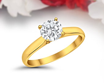 Classic Solitaire 1ct Round Diamond CZ 14K Solid Yellow Gold Wedding Engagement Ring 4 Prong Anniversary, Bridal, Not Plated Solid Gold