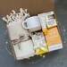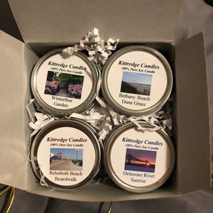 Materials: soy wax, cotton wick, fragrance oil, travel tins, excelsior shavings, white giftbox with clear plastic lid, silver or gold stretch ribbon