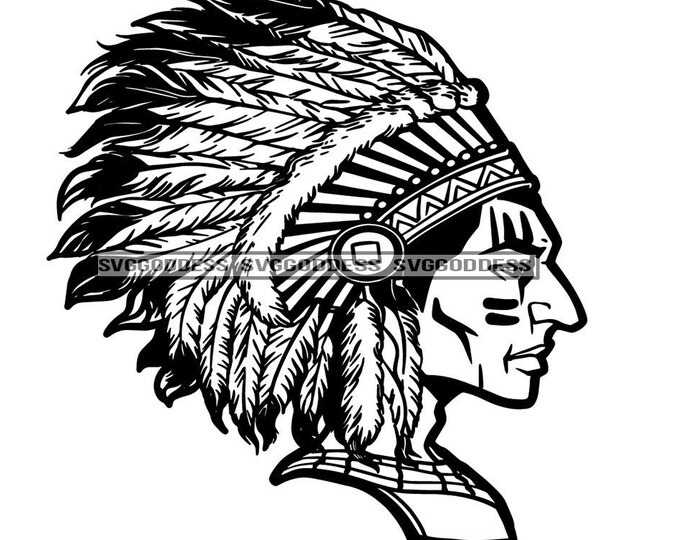 Native American Indian Side View Feathers Tribal Ethnic Traditional Headdress Face Warrior B/W SVG JPG PNG Clipart Cricut Silhouette Cutting