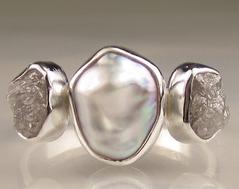Baroque Pearl and Rough Diamond Ring - Recycled Sterling Silver Engagement Ring - Made to Order