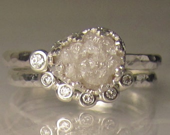 White Raw Diamond Engagement Ring, Raw Diamond Wedding Set, Hammered Rough Diamond Ring