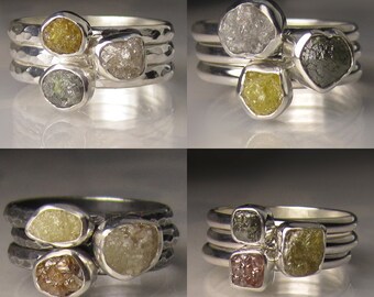 Silver or White Raw Diamond Engagement Ring - Three Stone Diamond Ring Custom- Recycled Palladium Sterling