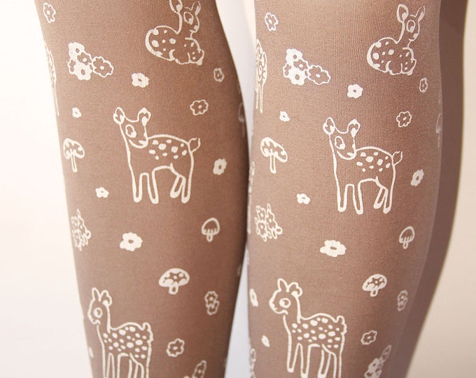 Deer Tights Small Medium Fawn & Mushroom Print White on Mocca Mocha Coffee Brown Women Mori Girl Toadstool Forest Cute Retro