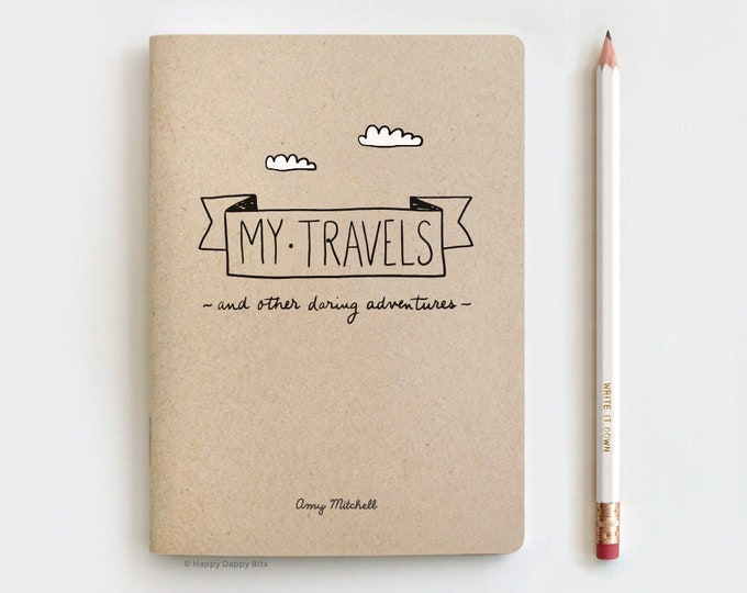 Personalized Travel Journal & Pencil Set Gift, My Travels and Daring Adventures Journal Recycled, Eco Friendly Gifts 5x7 " Stocking Stuffer
