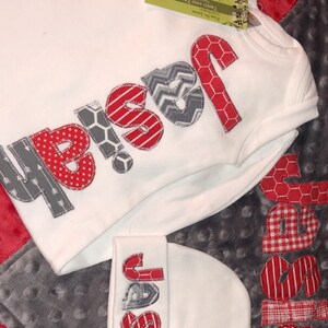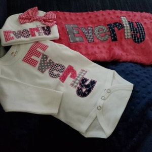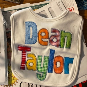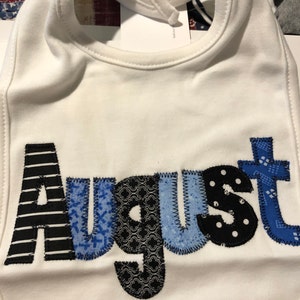 The name is appliqued using a variety of fabrics using cotton animal prints. Six letters fit nicely and sometimes I can get 7 letters, depending on the name. The font size and style will vary depending on the name. Not all names will fit with every font. I sometimes have to use what will fit and looks best. I like to use the largest font that will fit.