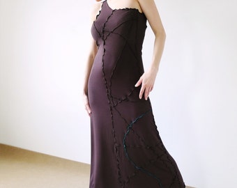 Fabulous long dark brown jersey dress with an unique, versatile design; it can be worn both as an asymmetrical one shoulder dress, and as a comfortable skirt or a tube dress with the top folded down, spiraling ties falling as an other layer of goodness.