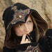 The top and the side panels have crazy freehand serging, mostly with dark brown with a few light blue accent lines.
