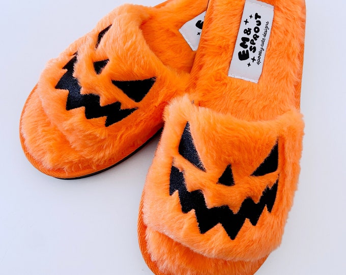 Halloween Fuzzy House Slippers - Orange Jack O Lantern Pumpkin Shoes
