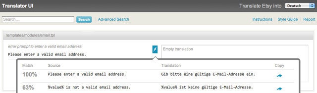 As we mentioned in Teaching Etsy to Speak a Second Language, developers need to tag English content so it can be extracted and then translated. Since we are a company with a continuous deployment development process, we do this on a daily basis and as an result get a significant number of new messages to be translated along with changes or deletions of existing ones that have already been translated. Therefore we needed some kind of recollection system to easily reuse or follow the style of existing translations.