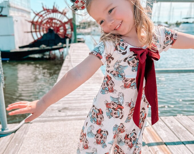 Vestido tipo jersey o top peplum con corbata Ascot para cruceros de Disney, conjunto de Mickey y Minnie Mouse, conjunto para niño pequeño de cruceros de Disney, ¡Ahoy!, sombrero de capitán.