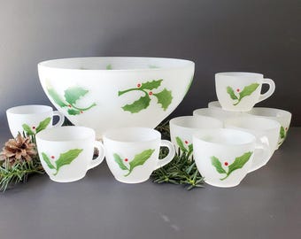 Vintage Hazel Atlas Swirl Punch Bowl and 12 marching self hook cups