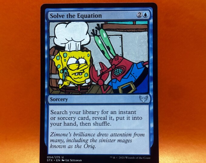 Tarjeta MTG "Resolver la ecuación", pintada a mano, como un meme de Bob Esponja