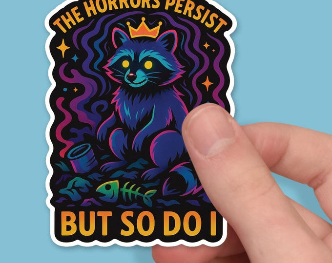 The Horrors Persist But So Do I Sticker, Funny Raccoon Sticker, Dumpster Fire Sticker, Water Bottle Decal, Kindle, Mental Health, Meme Decal