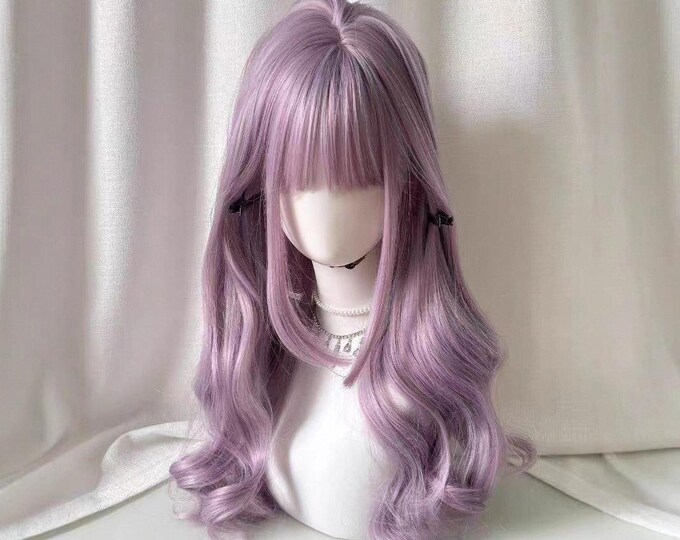 Women's Wigs - Pink Purple Sideburns Bangs Long Curly Hair, Big Waves, Neutral Gothic Long Hair - Halloween Role Play Wig [Youthful]