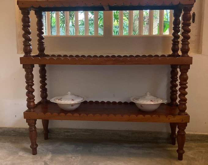 Estantería de teca de Birmania restaurada: expositor vintage de tres niveles