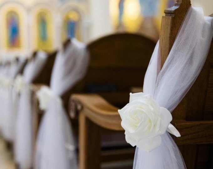 10 X Voile Pew End decorations - Wedding Church dressing ~ Pew Ends ~ Bows ~ Pew end Bows ~ Church Pew Ends ~ Pew end flowers ~ ivory rose
