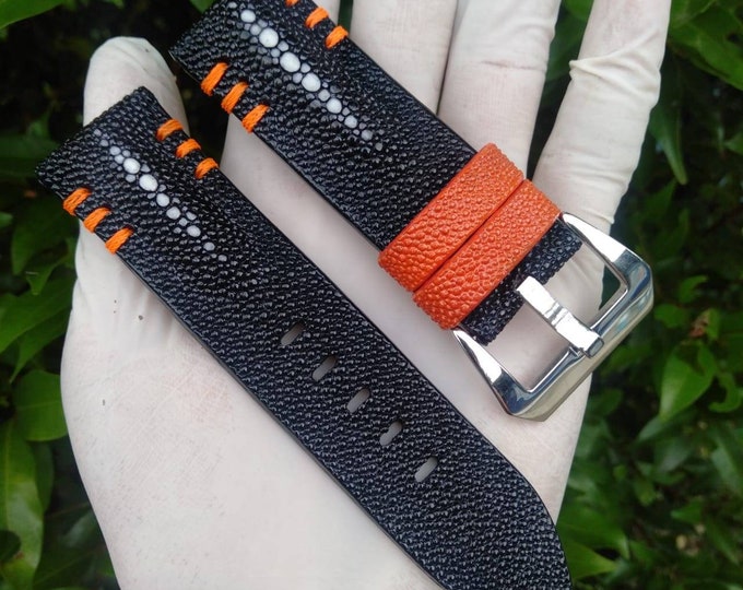 Stingray watch strap Double Diamond Black with orange accent handmade