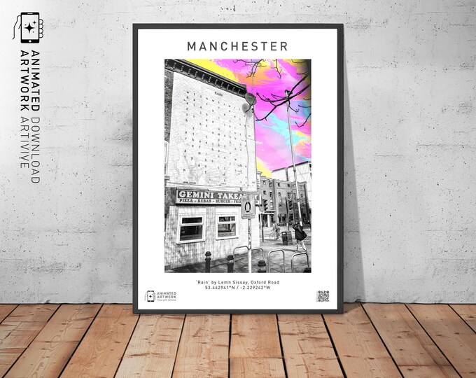 Póster de viaje con impresión de lluvia - Lemn Sissay, Oxford Rd / Ubicación de Manchester / Arte de collage de fotos psicodélico colorido / After The Rain MCR