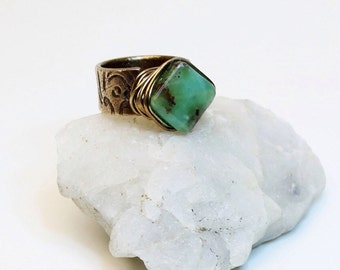 Wire wrapped chrysoprase ring, size 6, bronze and brass, handmade artisan jewelry, gift ideas, metalwork ring, OOAK ring, green, metal clay