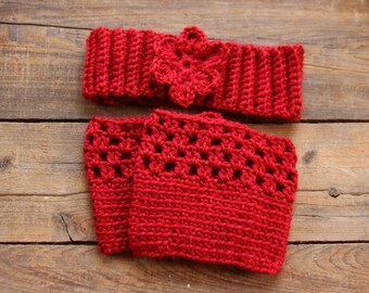 Crochet boot cuffs, ear warmer set, gift set, red boot cuff set, Valentine's Day gift, flower headband, winter accessory, green creek gifts