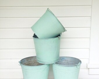 GARDEN BUCKETS, Large Tin Bucket, Vintage Metal Galvanized Beach Garden Pails, Planter Pots, Robins Egg Blue Chalk Paint Bucket