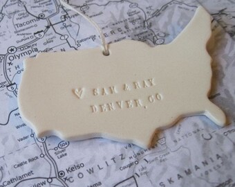 personalized CUSTOM map ornament where we met or where you were born with personalized names, date and location by Paloma's Nest