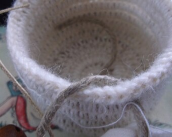 Woolen Garlic Basket, Creme De La Creme, Crochet Around Hemp Rope Basket, Treasure Trove Basket, Brushed Cotton Ribbon and Rustic Bells
