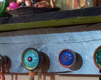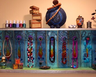 Hanging necklace holder pallet art decorative reclaimed pallet wood hand-painted in blue hues with silver edges & 10 hand-painted knobs
