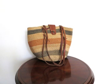 70's Boho Jute Straw and Leather Market Bag / Large Oversized TOTE Bucket Bag / Hand Woven / Grey Yellow Tan Neutrals / Vintage Hobo Bag
