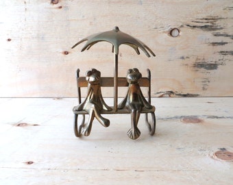 Pair of Frogs Bench Umbrella Brass Wedding Gift Rustic Decor Collectible Couple Friends 1970's Vintage