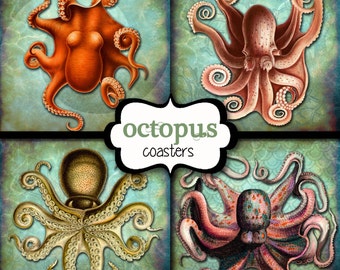 Digital Octopus Coasters, Steampunk Octopus Art, Octopus Magnets or Tags, Vintage Octopus Printable