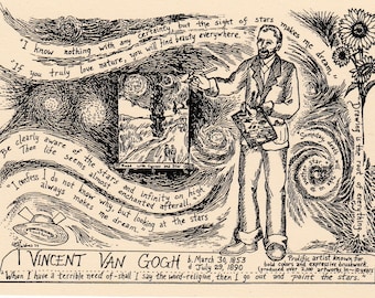Vincent Van Gogh tribute notecards, pack of 6 with envelopes on ivory stock-drawn, printed and packed by LC DeVona of Farmhouse Greetings.