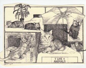 Cat Collage-This 6-pack of blank, ivory cards w matching envelopes features a penned collage of cats posing by Linda DeVona.