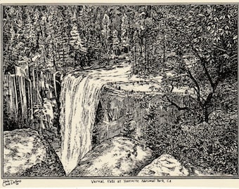 Yosemite's Vernal Falls, CA-This 6-pack of blank, Ivory notecards with envelopes features an ink drawing by LC DeVona of Vernal Falls