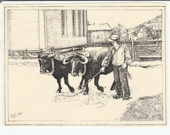 Yoked pair of oxen-This 6-pack of blank, ivory notecards w env features an ink drawing of a pair of oxen at the Cooperstown Farmers' Museum