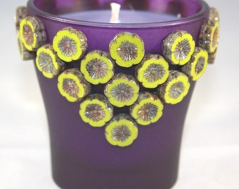 Soy Wax Embellished Candle, Yellow Green Czech Glass Flower Beads, Handmade, YOUR SCENT CHOICE, Hand Poured in Purple Flared Glass