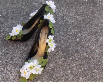 Recycled Black Fairy Shoes with Green Leaves and White Blossoms, Size 7 Heels, Fairy Cosplay High Heels, Festival Pumps, Bridal Flower Shoes