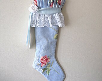 Christmas Handmade Roses Stocking 20" Lace Cotton Stocking, Hand Sewn Lined Stocking, Cabbage Roses Stocking, Egg Blue Holiday Decoration