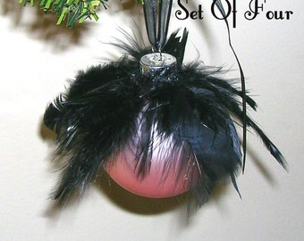 Set 4 Pink Glass Ornaments Balls Black Ostrich Feathers Decorations Holiday Designer Tree Elegant Original Design