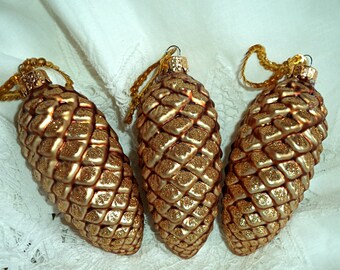 Beautiful Set 3 Pine Cone GLASS Ornaments Gold Sparkling GLITTER Vintage Sequin Hangers Christmas Tree Decoration