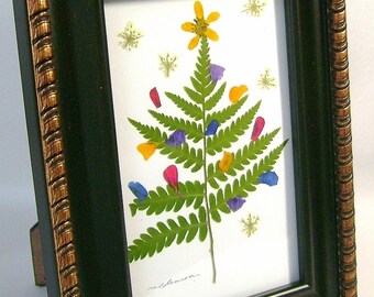 Framed pressed flower Christmas tree picture, Fern Christmas tree, holiday table top decor, Pressed flowers, Botanical, Ferns, Marigolds