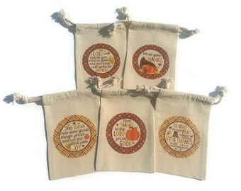 Thanksgiving Set of 5 Muslin 4x6 Gift Bags Fall Harvest Goody Favor Bags Pumpkin Religious Give Thanks to the Lord Psalm 107 Wedding Shower